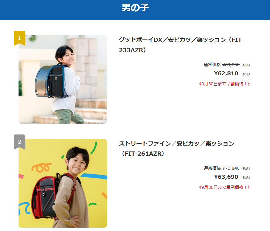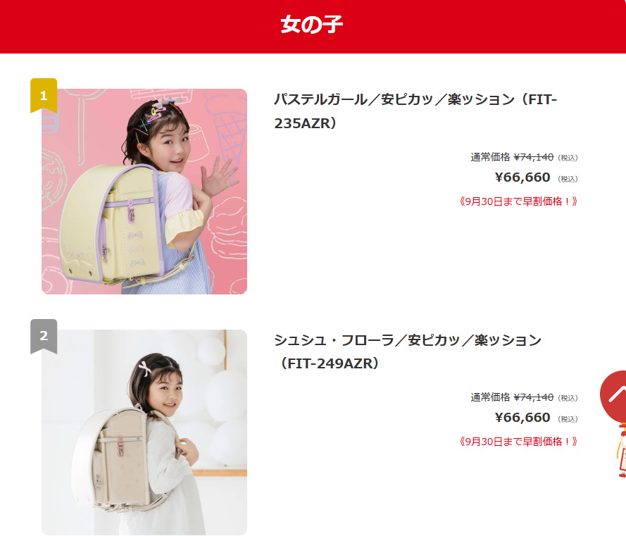 価格・重量・特徴を一目で確認できるので、お子さまにピッタリのランドセル選びにお役立てください。