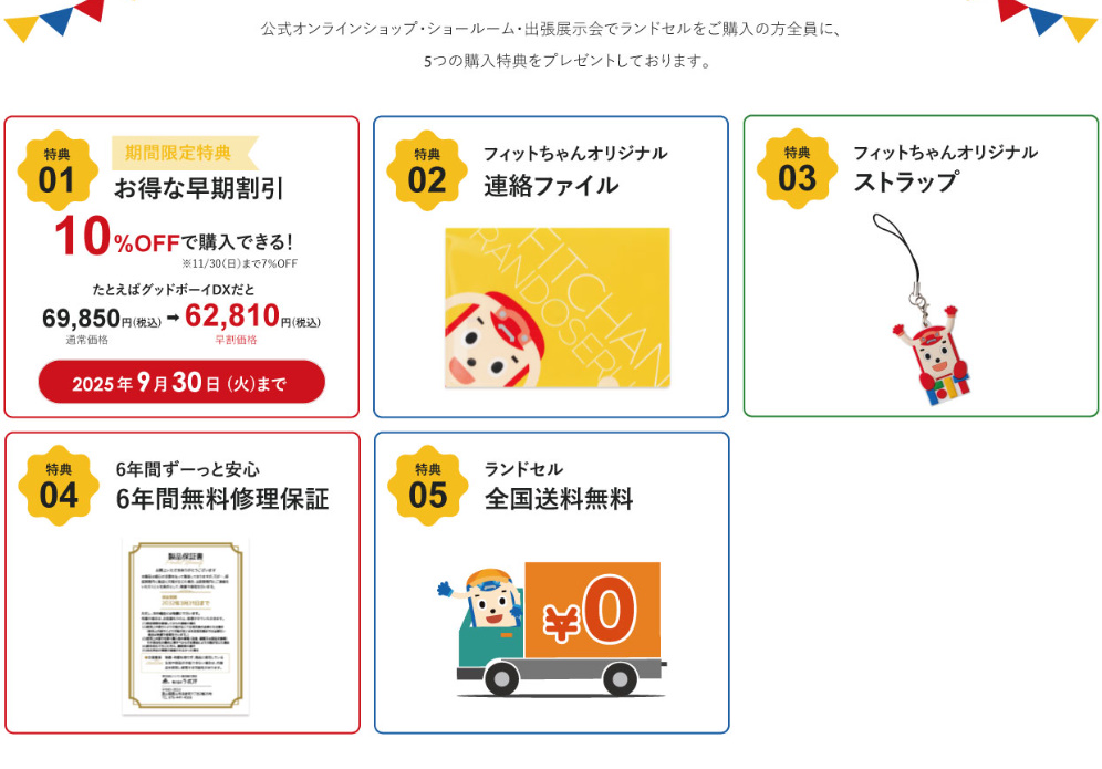 国内製造販売本数No.1の「フィットちゃんランドセル」は、機能性・デザイン・安全性の三拍子がそろった大人気ブランド。公式ショップでの購入なら、6つの特典付きでさらにお得です!